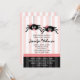 Estes convites para bebês de aranha são mais doces do que assustadores. Duas aranhas-bebê com um pacificador na boca e um arco rosa na cabeça caem do topo desse convite de chá de fraldas de gêmeos rosa, pretos e brancos listrados e sangrados. Trabalho de arte © Chrissy H. Estúdios, LLC. Todos os direitos reservados.
