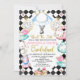 Twins Black Diamond Alice No Aniversário do Onderland Invitation Gêmeos doces Alice em uma terra de convite de aniversário com Alice e vários itens e personagens da história em um fundo de padrão de diamante preto. Esta Alice no mundo maravilhoso tem um convite de aniversário doce para convidar convidados para uma Alice em Onederland, a festa de aniversário temida para as suas gêmeas. O texto Dourado é removível.