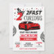 Editable cute race car theme kid's 2nd birthday party invitation card featuring illustration of a red car. The text says "2 fast 2 curious"