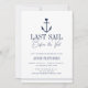Convide os laços da noiva para uma festa de solteira no mar com estes modernos convites náuticos e combos itinerários. Design apresenta uma ilustração de âncora de uma nave azul marinho, tocada por um pequeno coração, com duas linhas de texto personalizado por baixo; mostrada com "Última Vela Antes do Véu". Personalize a frente com seus detalhes de convite e adicione o itinerário de fim de semana ao verso. As cores podem ser alteradas para corresponder às cores preferidas usando a ferramenta design do Zazzle.
