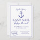 Celebre a sua "última vela antes do véu" com este convite de fim de semana de despedida de solteira de temas náuticos, ilustrado em tons oceânicos de azul e branco nítido. Apresentando detalhes encantadores desenhados à mão de um boné, âncora e barco clássico do capitão. Ele evoca o mar à beira do mar com um toque de sofisticação. A frente introduz a celebração do fim de semana com uma elegância maravilhosa, enquanto as costas descobrem um itinerário maravilhosamente organizado para guiar a sua tripulação através de cada momento inesquecível.