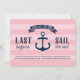 Este convite para festas de solteira bonitinho, tema náutico apresenta uma faixa azul-marinho rústica, e uma tipografia divertida que diz "Última vela antes do véu", e um fundo rosa listrado. O texto adicional pode ser adicionado à parte traseira da placa, se desejar.