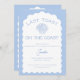Celebrar a noiva a ser com o nosso encantador convite de festa de solteira náutica! Marque um cheio de diversão no final de semana com nosso design de "Último Brinde na Costa" com matizes azuis leves, um arco ondulado e uma concha. Este convite digno de marítimo dá o tom para uma aventura marítima com um itinerário detalhado para o fim de semana para manter as festividades em curso. Prepare-se para ancorar e desfrutar de uma fuga costeira cheia de risos, memórias e vibrações náuticas. Acabe com o nosso convite de moda e faça ondas no último bash de solteira!
