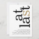 No Último Código QR, Anúncio e Convite de Festa de noivado Dourada Preta Branco. Um design tipográfico moderno, com Finalmente em grande tipografia girada e à direita no topo, em preto com ouro para a letra "s" num fundo branco. A cor do plano de fundo pode ser alterada em cada lado se você desejar por meio de Personalizar mais. Esta versão do convite é destinada às partes em mente que se realizam em um hotel ou restaurante (ou qualquer local com um site), substituem o código QR no verso por um código QR no seu website para tornar conveniente que os convidados encontrem instruções, etc. Você pode criar códigos QR gratuitamente on-line. Procure "Criador de código QR" e muitas opções surgem para criar gratuitamente. Você também pode excluir o código QR e o texto na parte traseira, se não for necessário por meio de personalização adicional.