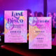Bachelorette Disco Ball do Retro 70 O convite semanal detalha o modelo itinerário com bolas rosa e roxas espumantes sobre um fundo brilhante. +++++++ Adequado para um destino moderno de tendência, retrorou noiva temática para ser celebrada.