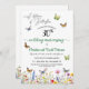 Um convite elegante para o aniversário do casamento verde com flores silvestres e borboletas coloridas que você pode personalizar adicionando seus detalhes.
