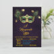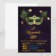 Convide seus convidados para uma noite de mistério e magia com este deslumbrante Convite de Baile de Máscaras. Este design elegante apresenta uma máscara veneziana dourada e verde-esmeralda lindamente detalhada, adornada com joias cintilantes e penas de pavão exóticas. Contra um fundo roxo real profundo com efeito de aquarela, este cartão exala luxo e drama.