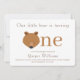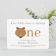 Um primeiro convite de aniversário para bebês com tema de urso, com um toque leve e aberto. Este convite é castanho e branco com a palavra "Um", com uma ilustração de rosto de urso como primeira letra da palavra. Simplesmente, personalize este convite, adicione-o ao seu carrinho e feliz aniversário ao seu maravilhoso bebê!