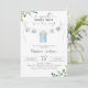 Um menino doce está a caminho! Celebre em estilo com este adorável convite de chá de fraldas com destaque para a lavanderia de cor aquosa de cor suave azul e verde elegante. Perfeito para o dia especial de um menino, esta design traz um toque novo e moderno para a sua celebração. Personalize-o facilmente para torná-lo exclusivamente seu!