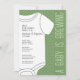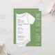 Um tema de chá casal divertido - Um Bebê está se preparando! Este convite para o chá de fraldas inclui uma camiseta de bebê bonitinha com fundo verde e fontes modernas de caligrafia para os nomes dos futuros pais. Adicione a informação da mãe para ser com informações da festa e onde a nova mãe está registrada para presentes. Este bebê gigante guarda todas as informações da festa. Um simples padrão de bolinhas está atrás.