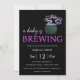 Simples e moderno convite para o chá de fraldas de Halloween com um caldeirão mágico sobre fundo preto. Com as palavras "um bebê está a criar" e estripar preto e branco para trás. Pronto para uma personalização fácil.