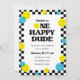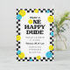 Um convite de festas divertido e brilhante com ícones de rosto amarelos e azuis sorridentes, e borda preta com verificação. "Um cara feliz" está em uma fonte retrógrada. Se você quiser alterar este texto, entre em contato comigo e farei atualizações sem custo extra. A parte traseira da placa apresenta um padrão de verificação azul e branco adequado à vibração retrorreflectora. Todas as cores são editáveis!