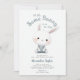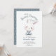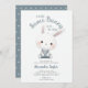 Uma ilustração encantadora de aquarela com um coelho precioso vestindo macacões decora este delicado convite para o chá de um bebê com um esquema de cor azul e branco empoeirado, que é um ajustado perfeito para uma celebração na primavera, eventos de Páscoa, um fête no jardim de verão ou um agradável chá de fraldas de piquenique.