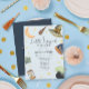 Divirta-se com um chá de fraldas de halloween com nosso adorável convite. O design apresenta ilustrações de aquarela de uma variedade de pequenos elementos fofos de feiticeiros, juntamente com uma tipografia escrita à mão para complementar a aparência com um cabeçalho que lê "Um pequeno feiticeiro está se formando". Todo texto é 100% personalizável.