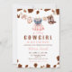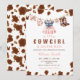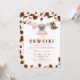 Este adorável convite apresenta uma pintura aquosa de roupas de menina penduradas em uma linha de roupas, incluindo um vestido rosa, uma bib, botas e pacificador. A linha de roupa é limitada por manchas de impressão de vaca marrom. O estilo é bonito e feminino. Se precisar de outro produto ou personalização correspondente, entre em contato comigo.