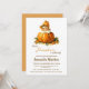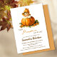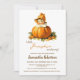 Elegante convite de chá de fraldas simples, com desenho de aquarela de uma menina sorridente e fofinha cercada por belas abóboras e cobertura de laranja macia pastel de outono sólido.