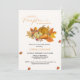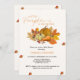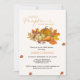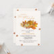 Um cartão de convite para chás de fraldas elegante e moderno com uma abóbora laranja queimada com folhas de outono. De acordo com a inscrição, "um pouco de abóbora está a caminho." Ideal para o chá de um menino perto da Ação de Graças.