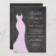 Um bonito vestido de noiva roxo decora este chá de panela sobre um fundo ilustrado de quadro-negro.