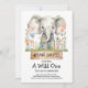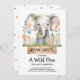 Este vibrante convite de um aniversário para meninos e meninas apresenta um doce elefante bebê aninhado em flores azuis e laranja e um verde exuberante. O tema do primeiro aniversario da selva de safari é uma ideia incrível para uma celebração em casa. A frase ousada A Wild One mostra que esta festa é cheio de diversão e mágica do primeiro ano! Esse convite para primeiros aniversarios safari é perfeito para mães planejarem uma celebração colorida e excitante de primeiros aniversarios com um tema animal safari. Personalize com os detalhes do seu partido e dê o tom para uma alegre e fotível aventura da selva que seu pequeno amará!