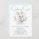 Esta design apresenta o tema de chá de fraldas Páscoa "Um Doce Alguinado Está a Caminho" para o chá de fraldas de um bebê com xadrez de gingham azul pastel e um belo coelho branco com uma ilustração azul de ovo de Páscoa. Este produto pode ser facilmente personalizado com os detalhes do seu evento pessoal.