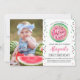 Este belo convite temático de melancia é perfeito para uma primeira festa de aniversário para uma garotinha que está fazendo um neste verão. Substitua facilmente a foto da amostra na metade esquerda da placa pela foto do seu filho. Na metade direita, as palavras "Um em Melão" aparecem em branco sobre uma aquarela redonda cor rosa e melancia verde. Adicione o nome da aniversariante em um script cor-de-rosa e detalhes da festa em fontes sans serif não pretas. O confete rosa e verde decora as bordas esquerda e direita. O verso apresenta um padrão repetido do mesmo motivo de melancia de aquarela sobre um fundo branco.