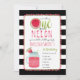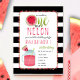 Tema do primeiro aniversário da melancia com a frase "um num melão" com fatia de melancia incorporada em design. Borda é pom inspirado. O fundo é uma faixa branca e preta. Mason jar melancia bebe no fundo.