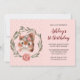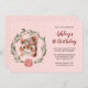 Um esquilo fofo com um buquê de rosas na cabeça em um quadro de folhas. O fundo é rosa claro com pontos