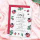 Convites de festas de primeiro aniversario de ladybug bonitos com o tema "um inseto giro" com ilustrações de cor-de-água vermelha e verde e de folha. Modelo editável com fundo vermelho.