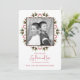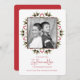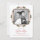 Verduras de inverno com cones de pinho e bagas de Natal vermelhas. Esta design apresenta um feriado de Natal, com um moderno vermelho e verde, um simples minimalista, uma foto, uma elegante folhagem botânica, verde, com bagas sagradas, pininhas pinecones, e tipografia com escrita de pincel, com alegria e amor pela paz