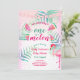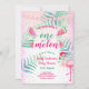 Um em um convite para Chás de fraldas de melão tropical com gráficos de aquarela, brilho cor-de-rosa (não brilho real) incluindo folhas de palmeiras e flamingo e água parecem fundo. Para suprimentos de parte correspondentes e edições personalizadas, entre em contato com o Designer LeahG.