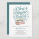 Um Novo Capítulo Começa O Chá de panela De Lobras Falsas Teais. Disponível digitalmente ou impresso. A citação A Novo Capítulo Começa é não editável e tem um efeito de falha falsa. Personalize facilmente o resto do texto para seus próprios detalhes. Com ilustração aquosa de livros e flores e anel de noivado.