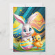 Um coelho alegre espreita de um ovo decorado, acompanhado por um adorável pintinho, contra um fundo vibrante e abstrato com padrões coloridos. A cena exala uma atmosfera lúdica e festiva, perfeita para celebrar um evento de primavera. Arte Digital