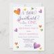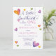Script de texto "A Little Sweetheart" com fontes serif "Is Turning One" precioso de aquarela do design First Festa de aniversário com texto roxo e rosa. Perfeito por comemorar seu doce pequeno! Design composto por Holiday Hearts Design (direitos reservados).