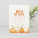 Prepare-se para um chá de fraldas com este charmoso convite para o Dia das Bruxas! A modelo apresenta uma fileira adorável de abóboras adornada com pequenos recortes em forma de coração no fundo, acrescentando um toque de doçura à diversão assustadora. No centro, a frase carinhosa "A Little Boo is due" define um tom lúdico, enquanto os detalhes da festa são bem organizados abaixo. Este convite caprichoso combina o espírito do Dia das Bruxas com uma sugestão de antecipação emocionante, fazer a forma perfeita de convidar os entes queridos a celebrar a chegada da sua pequena!