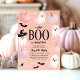 Um pequeno Boo está quase a chegar! Convite para Chás de fraldas do Halloween com fantasmas bonitinhos desenhados pela mão, abóboras, morcegos, aranhas e teias de esfregão em laranja pastel, pinks e roças. O convite perfeito para o seu Chá de fraldas temático de Halloween!