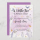 Um pequeno Boo está prestes a chegar! O tema do Dia das Bruxas Púrpura de Pastel bonito para os convites de chuveiros para bebês e meninos. O design moderno apresenta um fundo de cor da água super fofo com pequenos fantasmas, morcegos, folhas e ilustrações de abóbora. Perfeito para um garotinho e uma garota no caminho