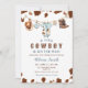 Este adorável convite apresenta uma pintura aquosa de roupas temáticas de vaqueiro penduradas em uma faixa de roupa, incluindo um chapéu de vaqueiro, bib, pijamas com impressão de vaca, pacificador e botas de vaqueiro. A faixa de roupas está sobre um fundo branco com manchas de impressão de vaca marrom no topo e no fundo. Se precisar de outro produto ou personalização correspondente, entre em contato comigo.