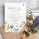 Moderna cor d'água floral "um pouco de flor selvagem está a caminho" boho chic neutro em relação ao gênero, simples e elegante modelo de chá de fraldas branco com flores silvestres naturais na fronteira florida e borboletas.