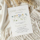 Celebre a chegada de uma pequena flor silvestre com este charmoso convite para o chá de fraldas. Apresentando flores silvestres de cor aquosa pintadas à mão em tons verdes, amarelos e azuis macios, esta design exumenta uma elegância natural e fresca. O delicado arranjo floral enquadra a tipografia de na moda, fazer perfeito para um primavera ou chá de fraldas de verão. Personalize com detalhes de eventos e material de papelaria correspondente para uma aparência coordenada!