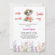 Um fundo branco chic. Decorado com um filhote fofo, cão vestindo um canuto e comendo melancia. Flores selvagens roxas, azuis, cor-de-rosa. Personalize e adicione o nome da mãe a ser e os detalhes da festa. Texto: Um Docinho está a caminho.