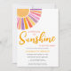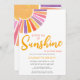 Você está planejando um chá de fraldas de menina? Este belo convite para o chá de fraldas, tema do sol, apresenta "Um pequeno raio de sol está a caminho!" em tipografia na moda amarela com um sol a aquarelas em tons de rosa, amarelo, laranja e roxo. Facilmente personalizável. Original Watercolor © Michele Davies.