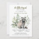Um pequeno malandro no caminho, adorável e fofo convite para chás de fraldas de aquarela de bebê guaxinim. Um estilo neutro por gênero para o seu convite honrando tanto a mãe como o pai. Cena rustica de floresta. Personalize para ambos os pais, ou apenas para a mãe. Disponível no impressão, como download digital ou ambos!