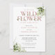 Um convite de chá de bebê de pequenas flores silvestres com uma elegante tipografia rosa poeira e belas folhagens de verde botânico. Criado por Thisisnotme©