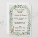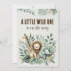 Um design minimalista com aquarelas safari animais bebês e folhagem mutada da selva, acentuado com texto elegante para um chá de fraldas neutro em termos de gênero ou para o primeiro aniversário.