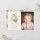 Este belo convite fotográfico de 1rua/primeiro aniversário da "algumas coelhinhas", feito por uma garota, apresenta um coelho/coelho de orelha-viva com flores lilás roxas em aquarela. O verso apresenta um fundo verde-claro de chá com padrões florais lilases púrpuros. Personalize-o para as suas necessidades. Você pode encontrar mais coelhinhos na minha loja.