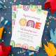 Deixe o sol brilhar e comemore seu futuro filho de UM ano! Celebre o seu primeiro aniversário com este convites de festas de aniversários temáticos boêmicos do arco-íris - apresentando o número UM soletrado com um arco-íris roxo e coral tocado, assim como vários arco-íris e sóis na fronteira do cartão, perfeito para meninas e meninos - neutro em relação ao gênero. Simplesmente personalize com seus próprios detalhes pessoais - e você também pode alterar a cor do texto nominal no editor.