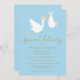 Apresentando um carregando de cegonha fofo uma entrega muito especial, em um fundo azul macio, este chá de fraldas, borrifo ou casal é perfeito para todos os pequenos que estão a caminho. Adicione seus detalhes de celebração em texto dourado para criar o convite perfeito. Projetado por Thisnotme©