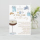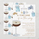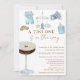 Um Tini está no Caminho Convite Espresso Martini para um Bebê - Um convite único e adorável para um chá de fraldas com um espresso martini adornado com blocos de bebês e itens de bebês, uma garrafa de bebê, um carro de madeira de bebês, macacões de bebês azuis, tênis de bebês e celulares de bebês com foguetes, estrelas e nuvens, todas ilustrações de aquarelas. Fonte de script elegante e manuscrita ao lado da fonte de bloco elegante em tom castanho. Edite este modelo de convite de chá de fraldas com seus próprios detalhes de evento. Perfeito para primavera, verão ou chás de fraldas de outono. Para pais ou mães procurarem por algo diferente e de um tipo. Disponível no impressão e no download digital, perfeito para envio via texto, email ou mídia social.