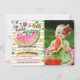 Seu docinho está girando um? Então este convite é para você! Apresenta uma foto do seu filho, uma fatia de melancia suculenta com uma picada com cipós e sementes. Acentos de folha de ouro falsos. Excelente para a garotinha virar uma. Ilustração desenhada à mão por McBooboos