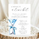 Uma Noiva Em Um Chá de panela Tini Bit Blue Martini - Celebra a noiva de estar com este convite para chás de panela do tema martini azul. Apresentando um lindo coquetel azul com um arco azul coquete. Uma mistura de script de afinidade e fonte de bloco elegante. Personalize este modelo de chá de panela editável com seus próprios detalhes de evento. Disponível em formato digital e para solicitar impressões. Perfeito para um chá de panela de martini ou coquetel temático "A Tini Bit", tema de bridal ou tema de chá de panela azul.
